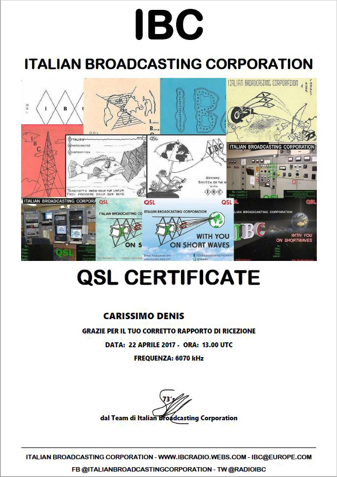 New eQSL from IBC (Italian Broadcasting Corporation) for a transmission of the 22/04/2017 on 6070 kHz AM. Report to [email protected], eQSL in 40 days.